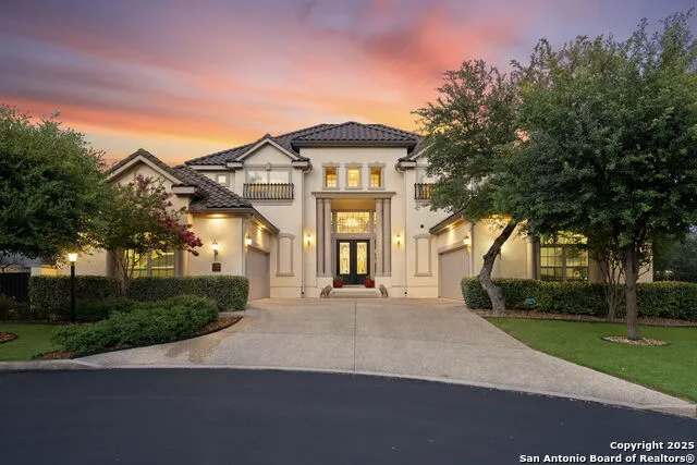 Exquisite Estate in The Dominion on expansive Cul-de-Sac Lot nestled on a spacious 0.36-acre cul-de-sac lot in the prestigious Dominion community, this elegant residence is surrounded by majestic, mature trees that provide serene privacy and natural beauty. Designed with the entertainer in mind, the generous layout seamlessly accommodates both grand gatherings and intimate evenings. Recent upgrades include a freshly painted interior, travertine and hardwood floors throughout the main level, plantation shutters, eight designer chandeliers, programmable thermostats, a water softener, and newly installed utility room cabinetry. The powder bath has been beautifully remodeled with a chic new vanity and designer wallpaper, adding a refined touch. Step into the light-filled living spaces enhanced by soaring ceilings, crown molding, and floor-to-ceiling windows. Formal and informal living and dining areas provide abundant versatility, while a dedicated wine cellar adds a luxurious flair. The newly updated gourmet kitchen is a chef's dream, featuring a stunning granite island with bar seating, a farmhouse-style copper sink, Miele dishwasher, Jenn-Air 6-burner gas range and refrigerator, and an additional wall oven. The kitchen opens to a cozy breakfast area and spacious family room-perfect for connecting with guests while preparing meals. The main-level owner's retreat offers a peaceful sanctuary with a large bedroom, spa-inspired bath, and dual walk-in closets. A private study and an additional guest suite complete the first floor. Two dramatic staircases lead to the second level, where you'll find three generously sized bedrooms, a home management center, a game room, and a media room-ensuring ample space for work, play, and relaxation. Step outside to a resort-style backyard, recently enhanced with a sparkling Canyon Creek pool and spa, complete with soothing waterfalls. A new pergola frames the outdoor living area, featuring a built-in stone fireplace and fully equipped outdoor kitchen with Bull grill, refrigerator, prep counter, and storage. The lush, tree-canopied yard offers shaded areas ideal for quiet reflection or al fresco entertaining. This home delivers the ultimate in refined living and entertaining-don't miss the opportunity to make it yours!
